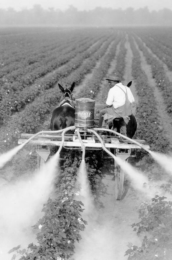 Adversity seemed to abound, and the boll weevil continued to be a threat. The only ammunition available to farmers was calcium arsenate. Because dew on the plants caused the dust to adhere, it was applied at night or early in the morning, initially by mule-drawn wagons and later by tractors. But by the mid-1930s, aerial application had replaced the ground dusting method and had become a thriving business.